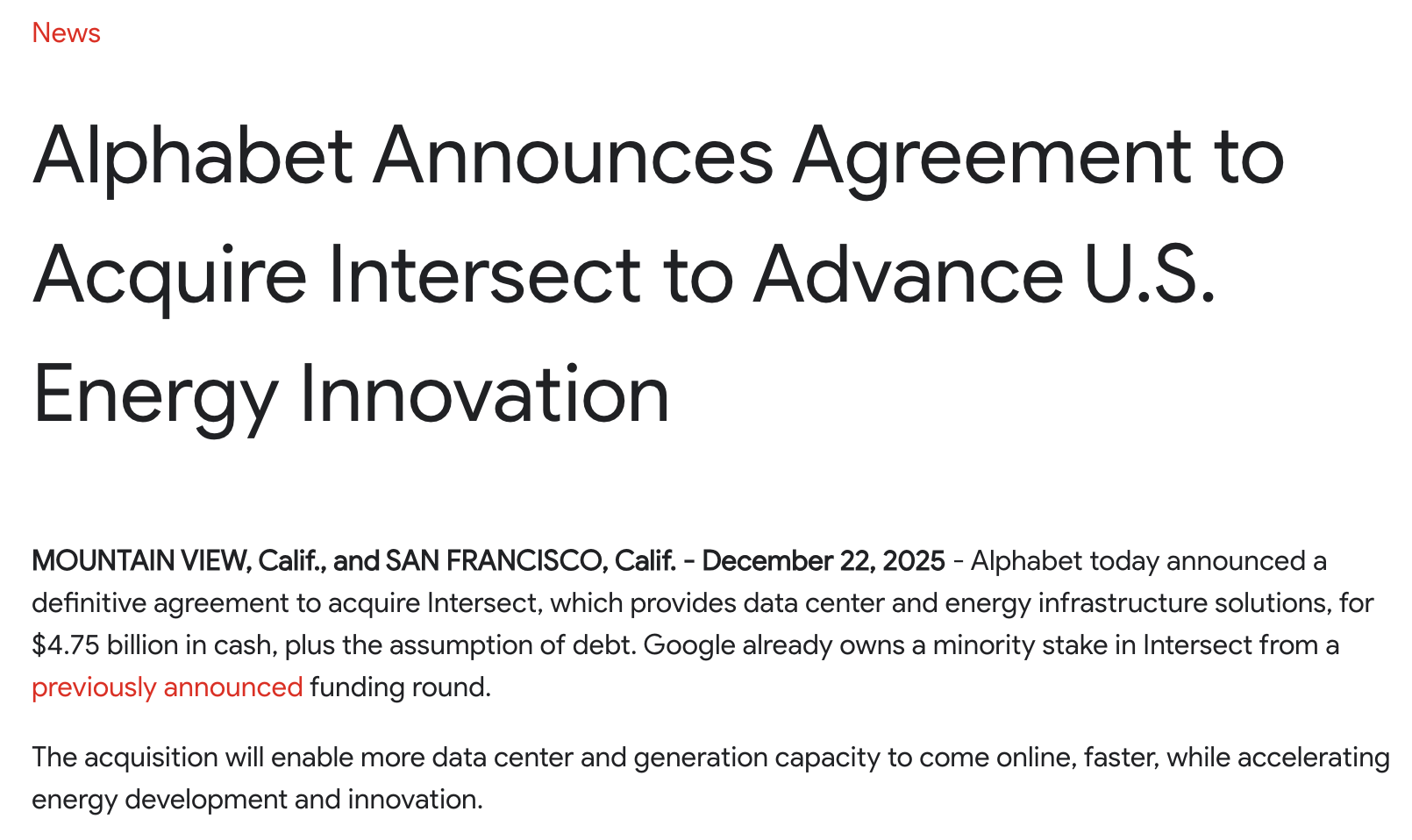 编辑 | 程茜智东西12月23日消息,昨晚,谷歌母公司Alphabet官宣将以47.5亿美元(约合人民币333.85亿元)的现金收购美国数据中心和能源基础设施公司Intersect,并承担相关债务。本次收购计划于2026年上半年完成。